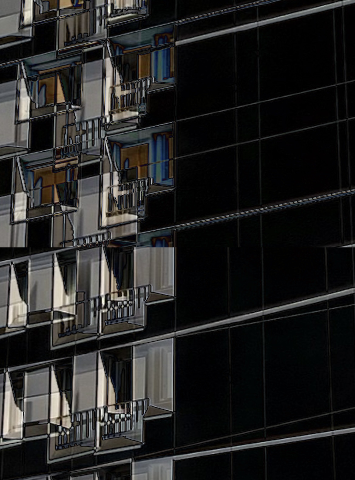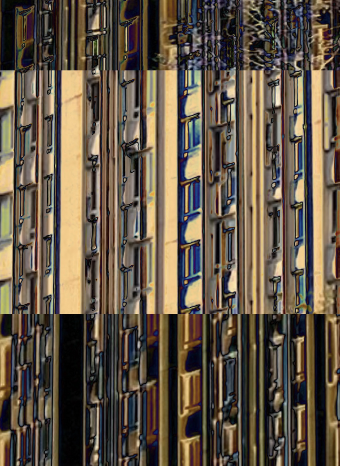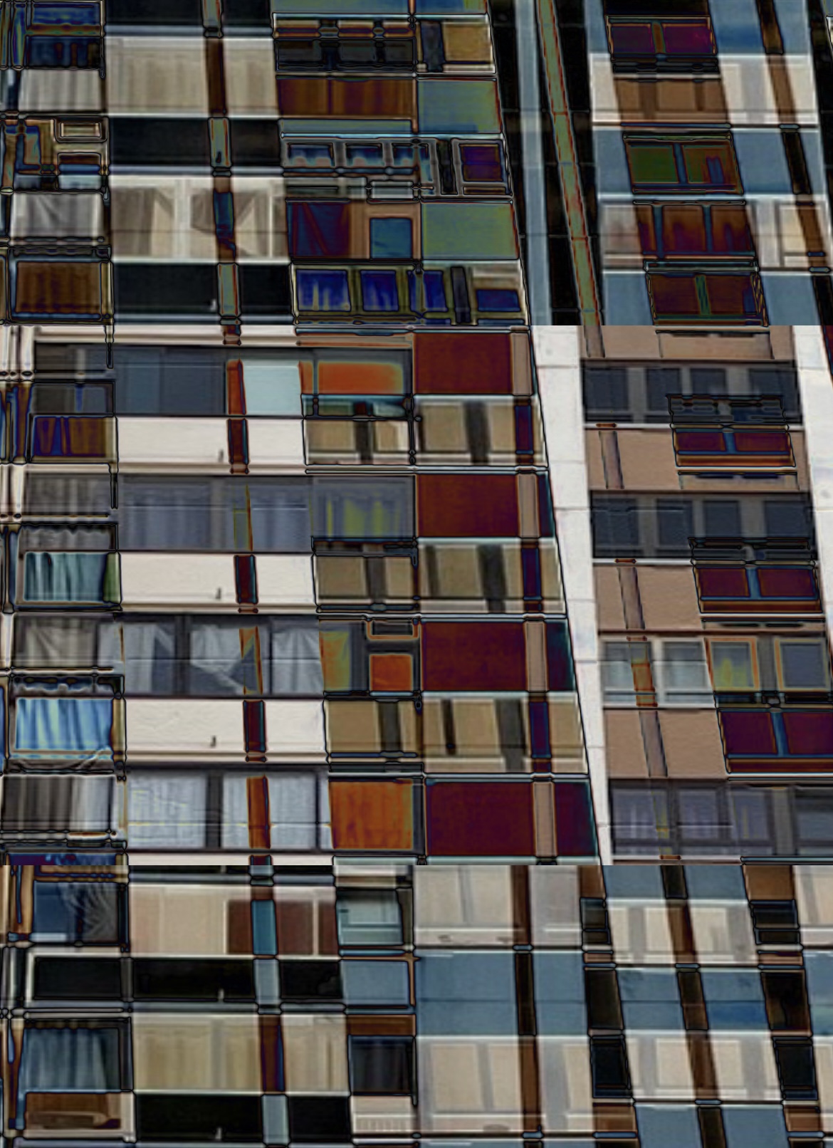 The photographs of Interference are taken in spaces of passage — corridors, crossroads, repeated facades. Places one traverses without really seeing. By subjecting them to tilt at the joint level, Printhelen forces a halt: the inclination of the plane makes the image waver, revealing what architecture conceals in its geometry.